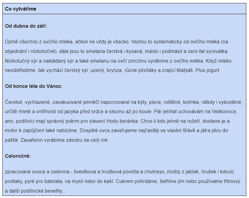 Někteří podílníci chodí co týden, jiným stačí párkrát za několik měsíců. Podílníkem se každopádně můžete stát minimálně na rok s ohledem na vrcholy sezon mléčného a jehněčího i na chudé období na přelomu zimy a jara. Aby si podílník prošel celým zemědělským rokem. Od května do září je potřeba rozebírat hodně, protože tehdy z ovcí nadojíme nejvíc, do Vánoc je zase až moc jehněčího. Prostřednictvím FB skupiny si dáváme vědět, co rovna je nebo naopak chybí. Semtam někdo do skupiny vyvěsí obrázek prosklené lednice z Nábřeží a my tu na farmě hned víme, že třeba zrovna brynza dochází, zatímco másla je stále dost. Jindy některý podílník strašně potřebuje žinšicu a dá nám o tom vědět. Nám pak nezbyde, než tu žinšicu prostě dodat, byť je to extra práce. Co bychom pro své podílníky neudělali…