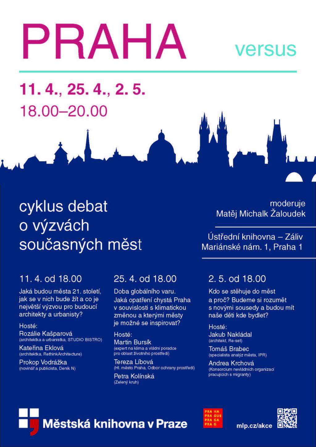 Při příležitosti 20. výročí vstupu České republiky do Evropské unie Městská knihovna v Praze ve spolupráci s Magistrátem hlavního města Prahy pořádá sérii debat „Praha versus“. V rámci tří různě tematicky pojatých večerů budou diskutující z řad odborníků, novinářů zástupců města i neziskových organizací řešit otázku, zda a jak efektivně dokáže metropole čelit aktuálním tématům, jako je urbanistický rozvoj, dostupné bydlení či klimatická změna.