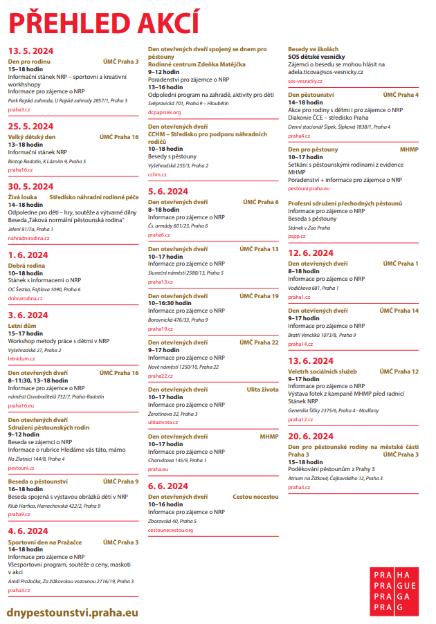 Je určen nejen pěstounům a těm, kteří by se chtěli stát pěstouny, ale i široké veřejnosti. Zahrnuje besedy a diskuse s odborníky, setkání s pěstouny, dny otevřených dveří v pražských neziskových organizacích a na úřadech městských částí, a další akce, které se budou konat na různých místech v metropoli.