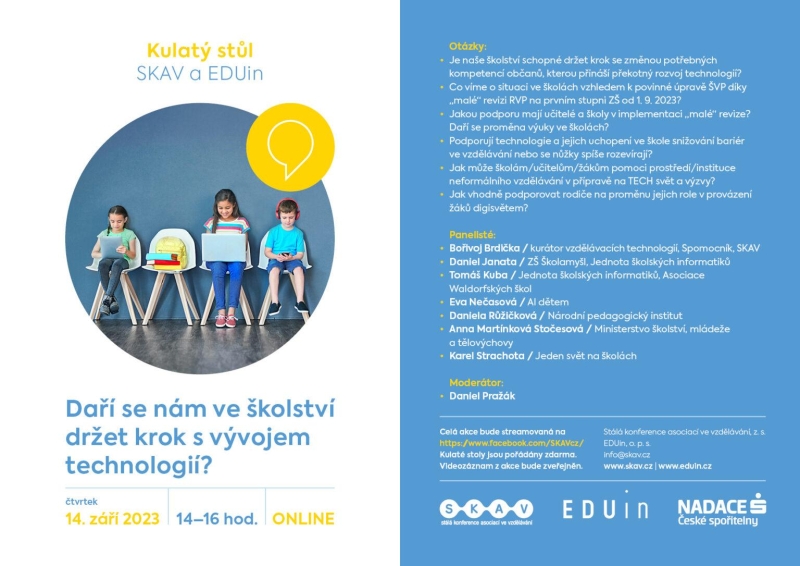 Změnám ve výuce spojeným s revizí RVP i překotným rozvojem umělé inteligence se bude hlouběji věnovat kulatý stůl SKAV a EDUin na téma Daří se nám ve školství držet krok s vývojem technologií? Rezervujte si čas ve čtvrtek 14. 9. od 14 do 16 hodin online.
