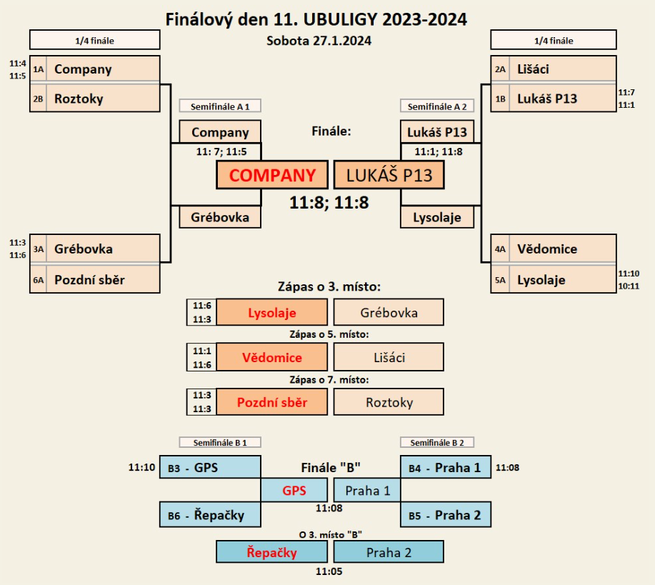 K vidění byla řada kvalitních zápasů s mnoha překvapeními. Tím asi největším byl postup LUKÁŠE PRAHA 13 až do finále. A to přesto že si samotnou účast v turnaji musel vydobýt v opravném osmifinále. Sobotní výkon jejich týmu (ve složení Petr Turek, Theodor Vrána, Zdeněk Madej, Helena Jeroušková a Marie Mašková) vynesl parádní 2. místo a plný koš francouzských dobrot z oblasti Cahors. Vítězi se stali COMPANY v jejichž barvách se kromě manželů manželů Lenky a Leoše Krejčínových a Pavla Fereše objevil i Petr Fuksa. Třetí místo obsadili Lysolajští. Oba týmy byli taktéž odměněni bohatými dárkovými koši z Cahors.