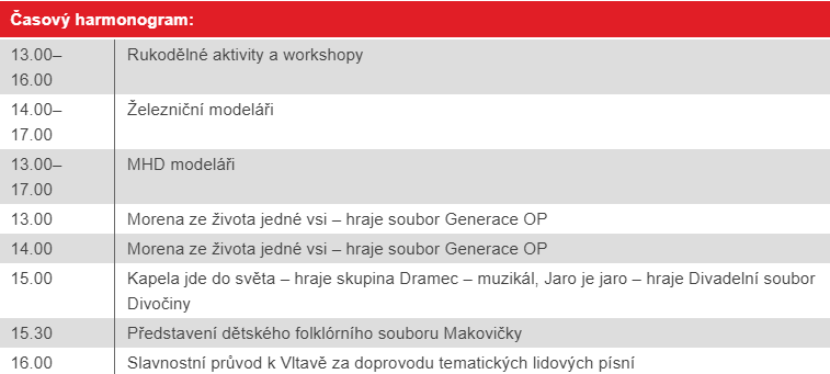 O bohatý kulturní program se postarají divadelní soubory Domu dětí a mládeže hl. m. Prahy a dětský folklórní soubor Makovičky. Po jeho vystoupení se účastníci vydají v průvodu společně s hudebníky a obřími maskami podél Vltavy. Průvod bude zakončen spálením Morany, která bude poslána po vodě zpět do podsvětí.